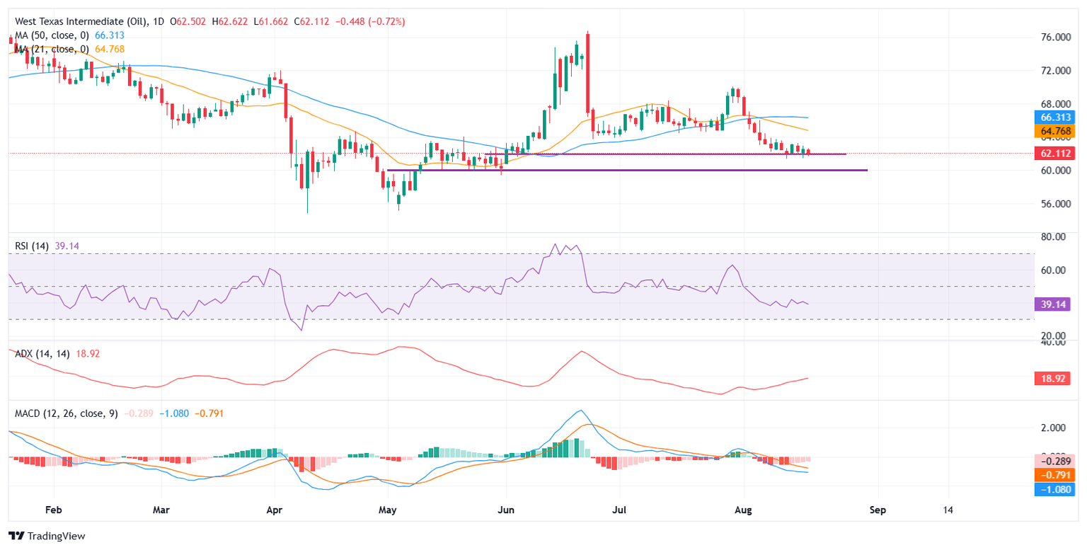 - WTI holds near $62.00 support with bearish technicals, trading below the 21- and 50-day SMAs, while RSI and MACD signal fading momentum