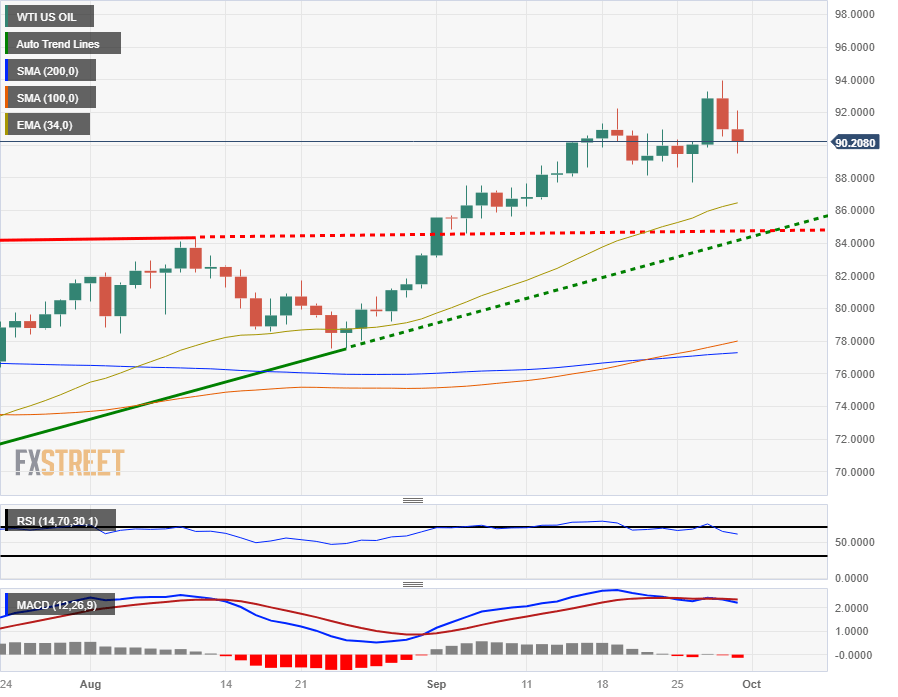 WTI crude barrel prices have tumbled back to the 200-hour Simple Moving Average (SMA) after reaching a peak at $94.00, and Friday's intraday upside whip sees near-term resistance priced in at the $92.00 price level.