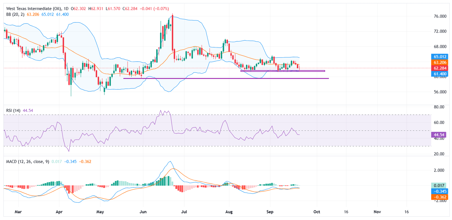 Overall, WTI remains confined to a range, with sideways trading likely to persist until a fresh catalyst emerges. A clear break below $61.50 would expose downside targets at $60.00 and $59.50. On the upside, a sustained recovery above $63.20 and the previous week’s high at $64.40 would pave the way for a test of the upper Bollinger Band near $65.00.