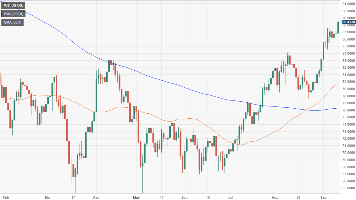 Western Texas Intermediate (WTI), the US crude oil benchmark, climbed more than 2% to a 10-month high in the mid-North American session, as oil supply is projected to remain tight. That, alongside supply cuts by oil exporting countries, underpins WTI price. At the time of writing, WTI is trading at $88.49 per barrel, up 1.95%.