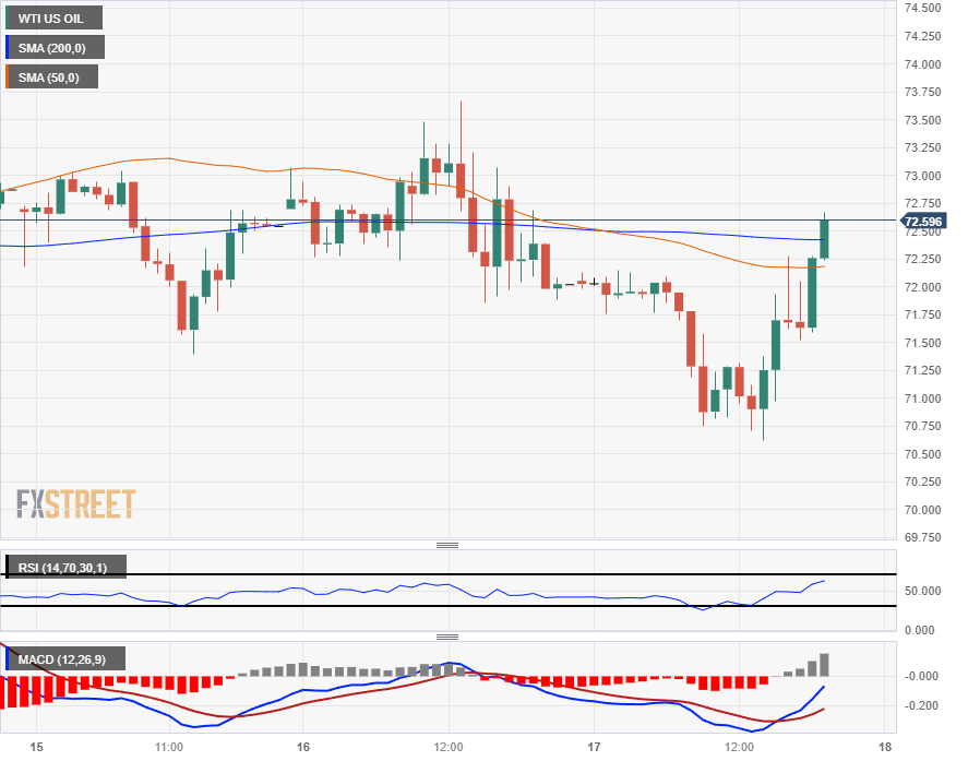 WTI’s early decline on Wednesday saw a rebound back above the 200-hour Simple Moving Average (SMA) near $72.40 as US Crude Oil heads back towards the $73.00 handle.