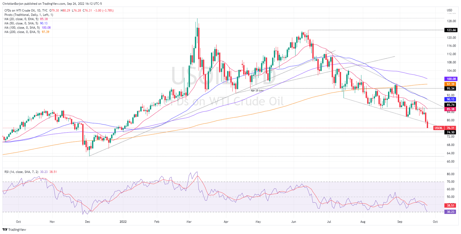 On Monday, the US crude oil benchmark, also known as WTI (Western Texas Intermediate), drops for the second straight day after sliding from above the $80 per barrel figure to the mid $70-$80s range. At the time of writing, WTI is exchanging hands at $76.31 per barrel, down by 3.63%.