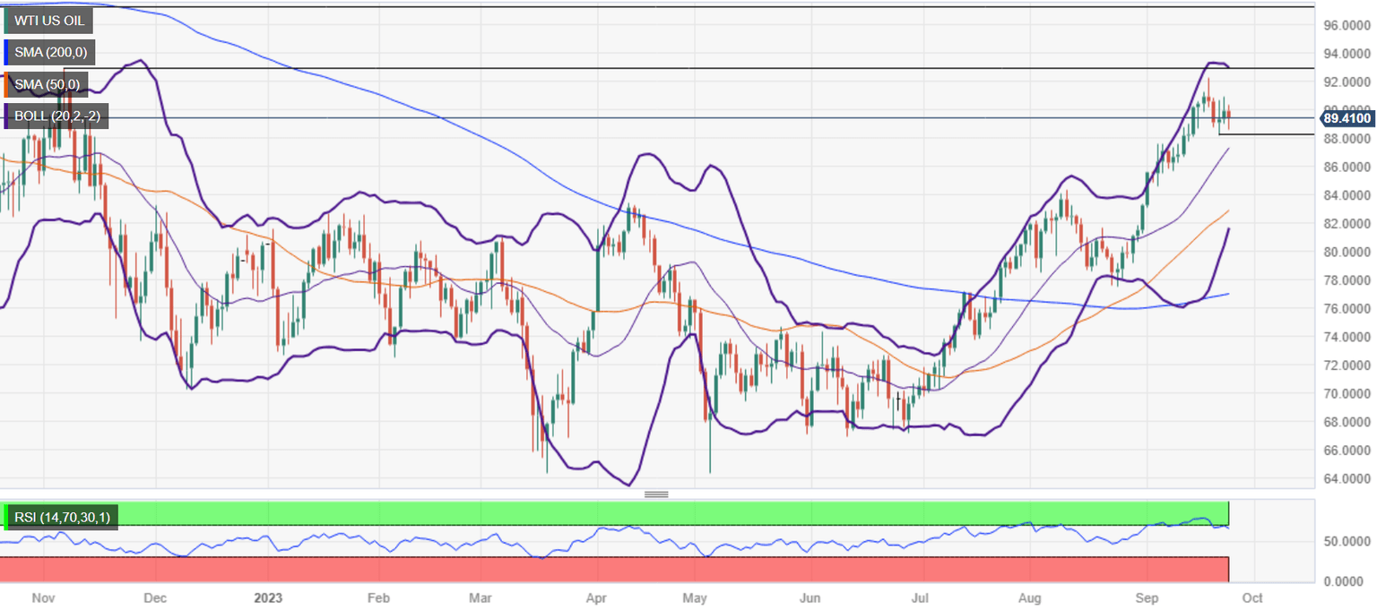 WTI remains upward biased but fails to pierce the top-Bollinger band, while the Relative Strength Index (RSI) exits from overbought conditions, opening the door for a pullback. Support is seen at the September 21 daily low of $88.15 before the US crude oil price tests the 20-day Exponential Moving Average (DMA) at $87.31. Contrarily, WTI would resume its uptrend but must clear last Friday's high at $90.93 before challenging the year-to-date (YTD) high at $92.26.