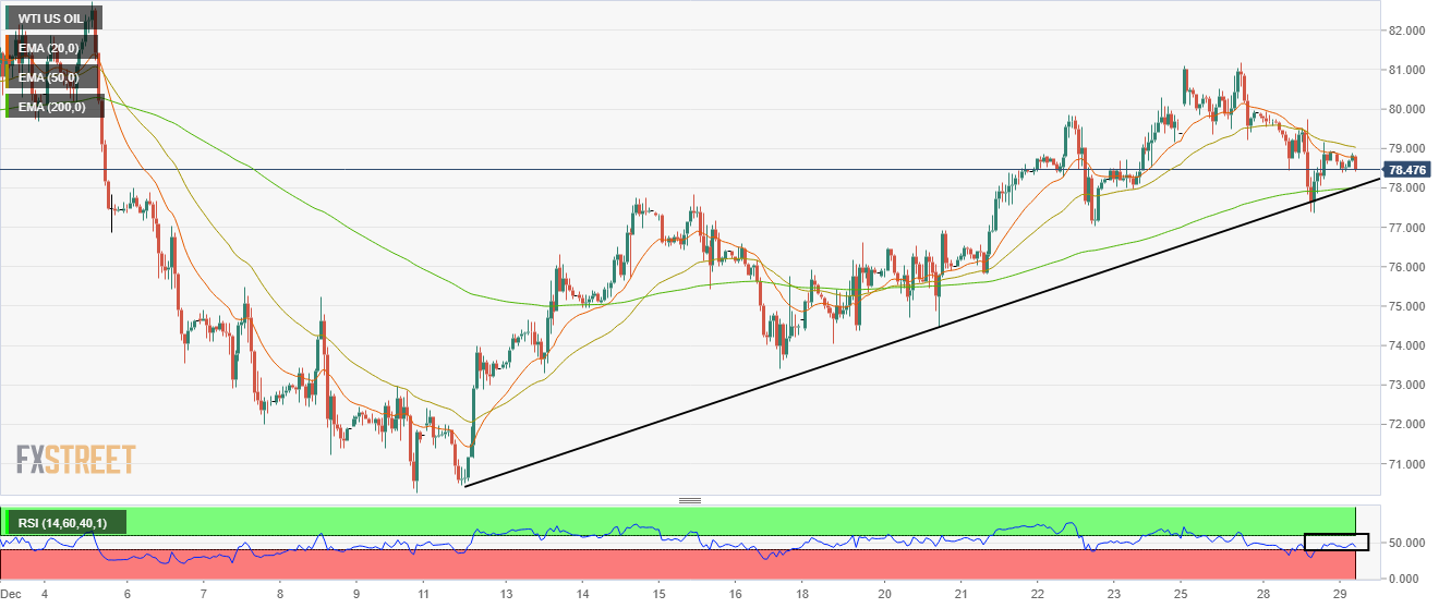 Oil price is hovering around the upward-sloping trendline plotted from December 12 low around $79.50. The oil price is at a make or a break level, therefore investors should brace for a decisive move. The 20-and 50-period Exponential Moving Averages (EMAs) have delivered a bearish crossover at $79.36, which indicates a downside move ahead. However, the 200-period Exponential Moving Average (EMA) at $77.89 has not been surrendered yet.