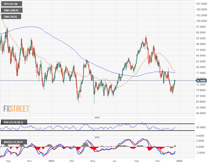 West Texas Intermediate (WTI) is struggling to develop topside momentum even as Crude Oil supply lines see a slight constraint after several firms have temporarily suspended sending Crude oil shipments through the Red Sea shipping lane after several vessels were attacked by Houthi rebels in Yemen.