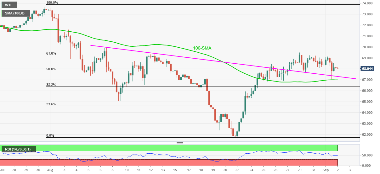 WTI seesaws around $68.10, after a two-day downtrend, during Thursday’s Asian session.