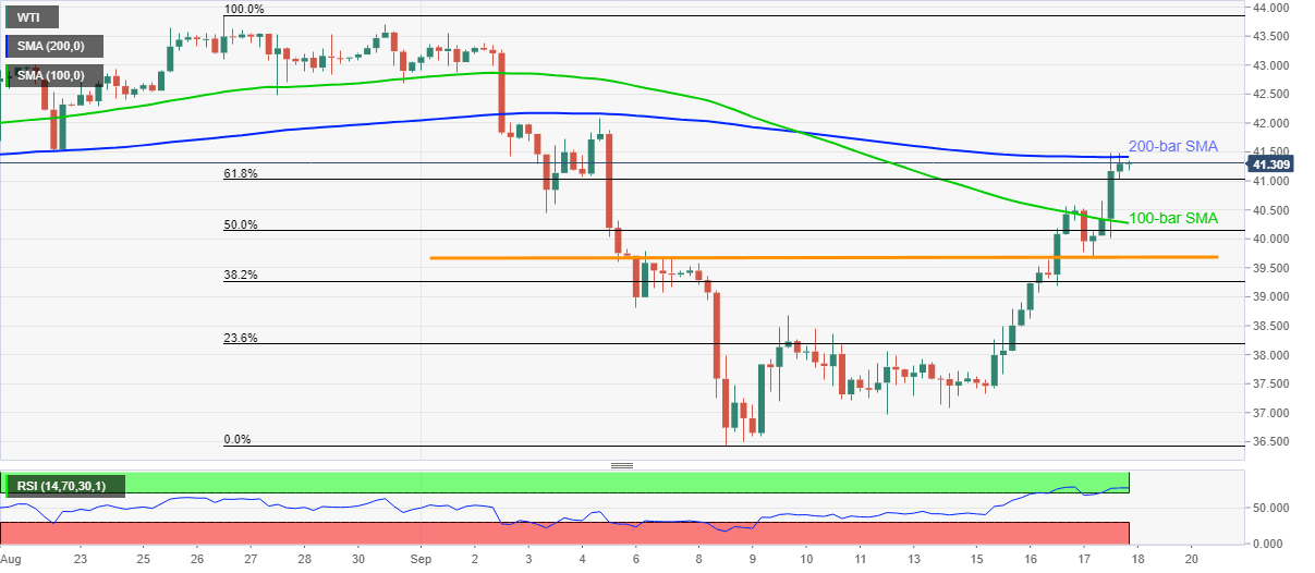 WTI consolidates the recent gains to $41.48 within a choppy range above $41.00, currently up 0.20% around $41.30, during the early Friday morning in Asia. The black gold surged to the highest since September 04 the previous day after breaking 100-bar SMA. Though, the 200-bar SMA seems to restrict the commodity’s latest up-moves amid overbought RSI conditions.