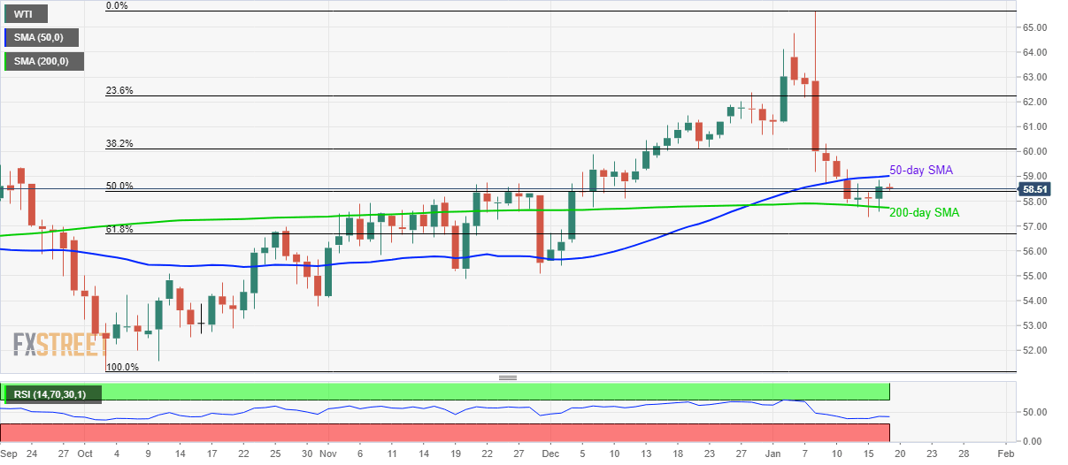 WTI trades around $58.50 during the early Friday. In doing so, the oil benchmark fails to cross 50-day SMA despite taking a U-turn from 200-day SMA, also trading successfully beyond 50% Fibonacci retracement of the October-January upside.