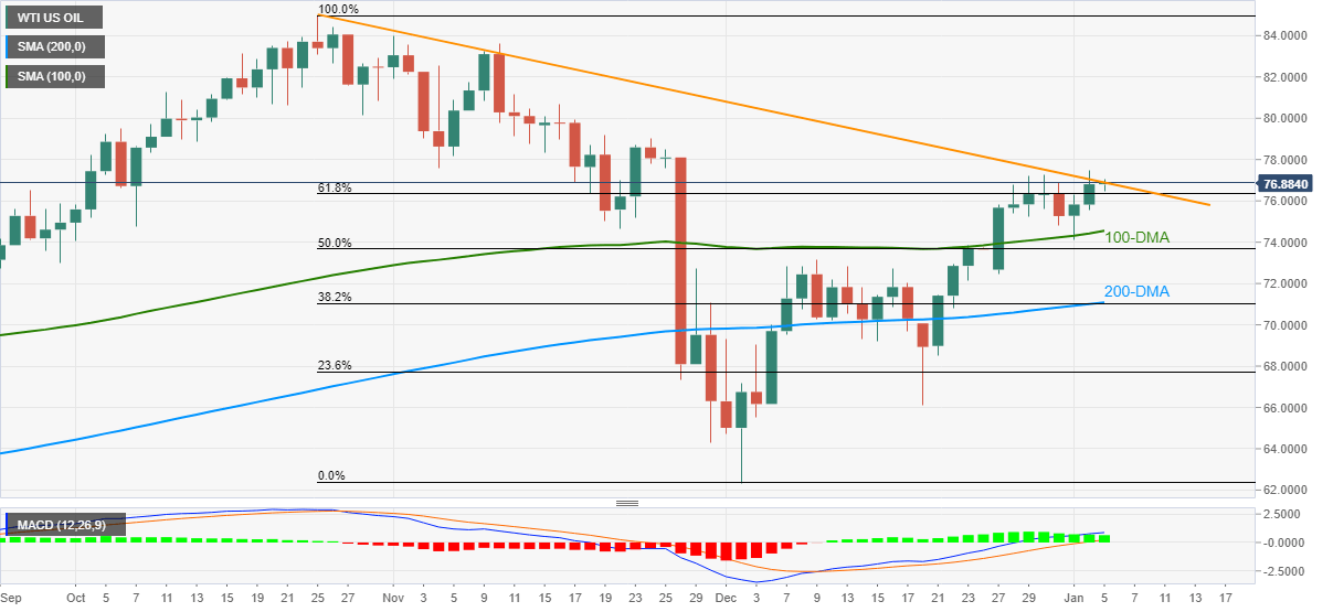 WTI Price Analysis: Battles 10-week-old resistance around $77.00