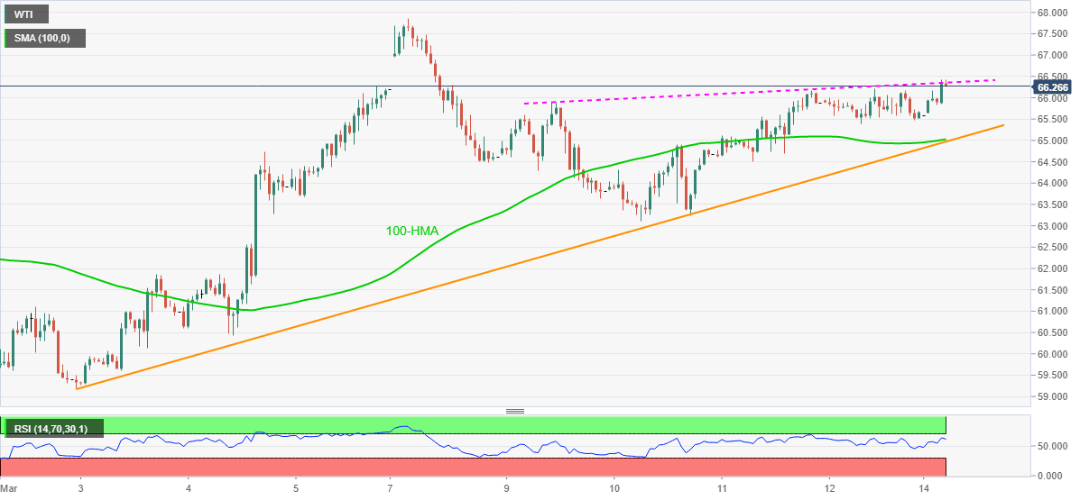 Following the recent uptick to poke immediate key resistance line on China’s upbeat data, WTI wavers around $66.30, up 1.0% intraday, during early Monday. In doing so, the energy benchmark justifies upbeat RSI conditions as well as the quote’s sustained trading above 100-HMA and an ascending support line from March 02.