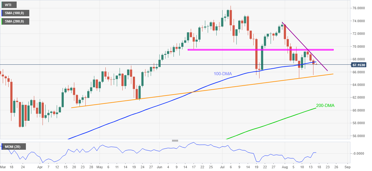 On the flip side, a sustained break of the 100-DMA level of $67.60 will direct the WTI prices towards a downward sloping trend line from July 30, near $68.10.