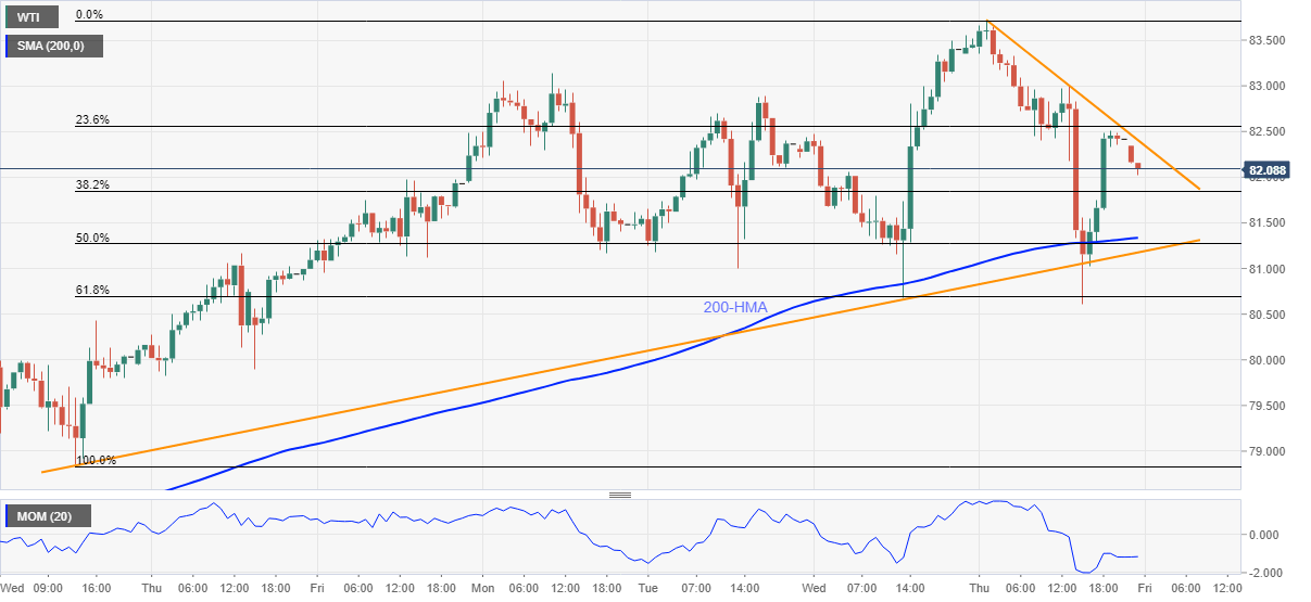 WTI fades late Thursday’s bounce off $80.60, following its U-turn from a seven-year high, during Friday’s Asian session. That said, the quote drops back to $82.00 by the press time.