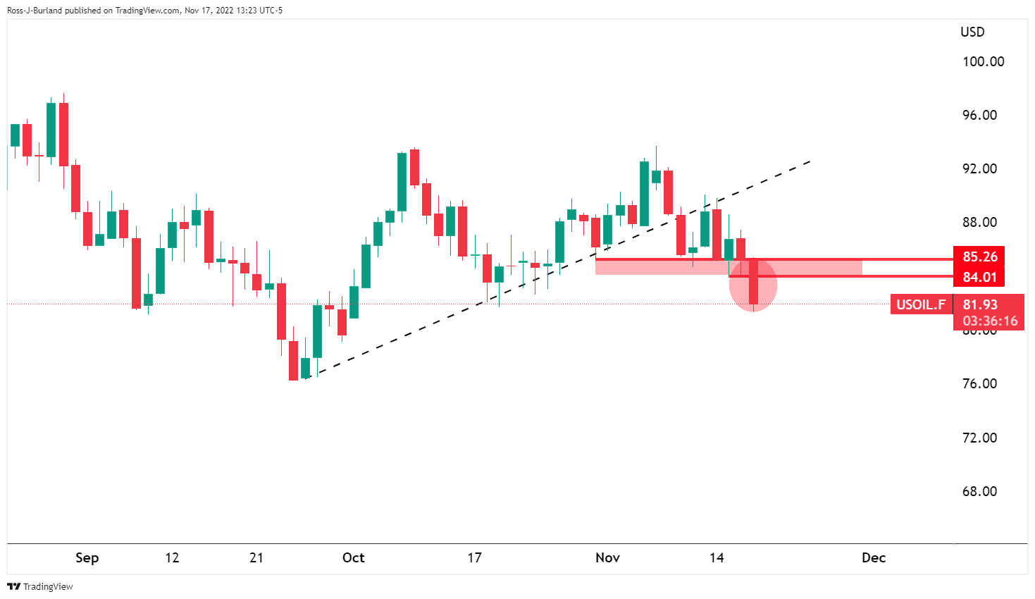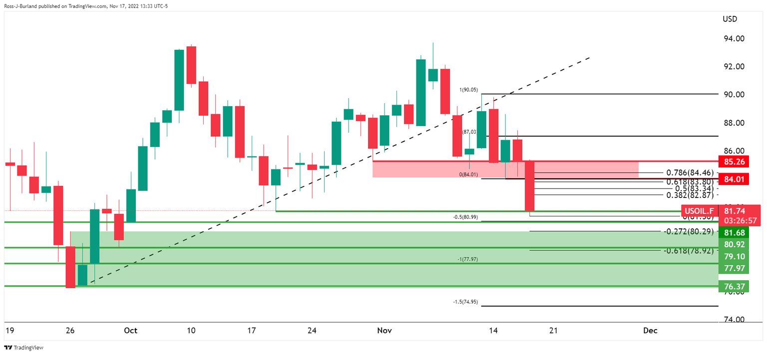As per the prior analysis, WTI bears are pressuring the bulls below critical resistance, break of $84.00 on the cards, and the price of oil dropped on Thursday into low-hanging fruit below 84.00 following a build-up of longs.