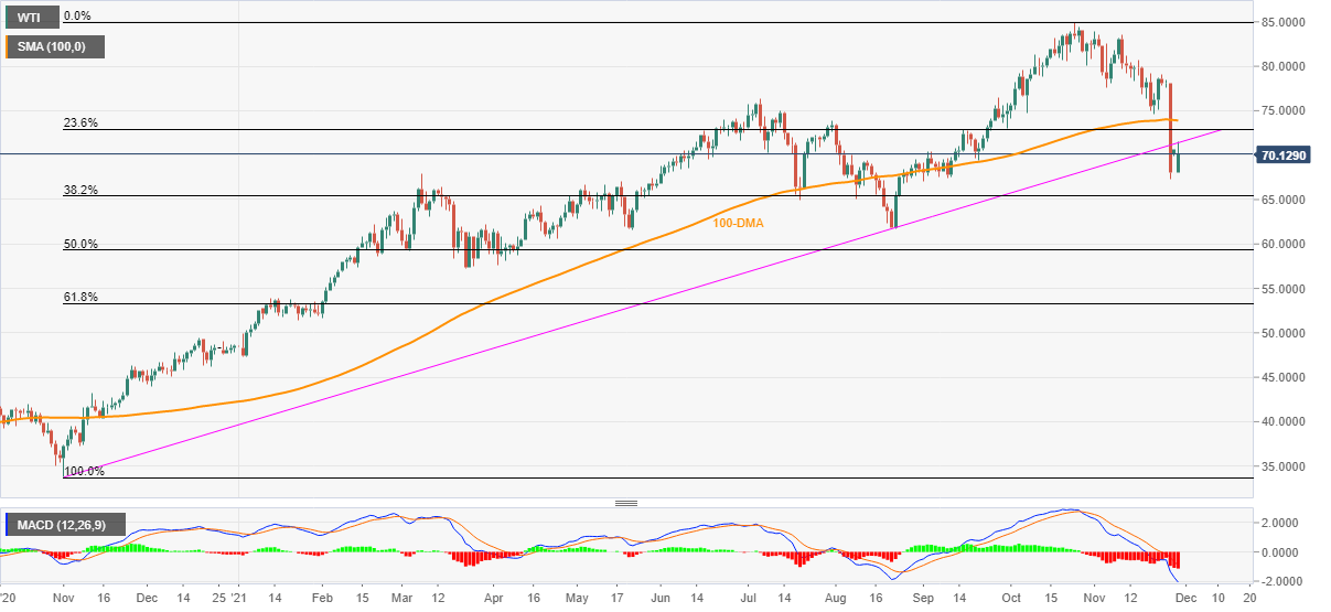 WTI licks Friday’s wounds of 13% slump while defending the $70.00 threshold during Monday’s initial Asian session.