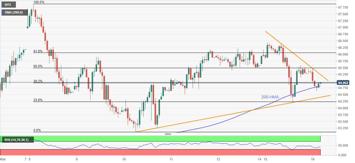 WTI eyes recovery pushing back the oil bears during the three-day downtrend on early Tuesday. In doing so, the black gold jumps off 200-HMA to print $64.90, down 0.60% intraday, by the press time.