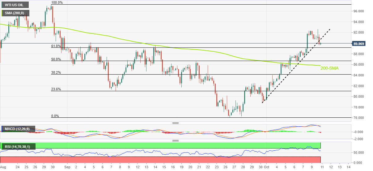 WTI crude oil prices remain depressed around $90.00 as bears take a breather following the first daily negative in six. However, the black gold’s downside break of a short-term key support favored bears during Tuesday’s Asian session.