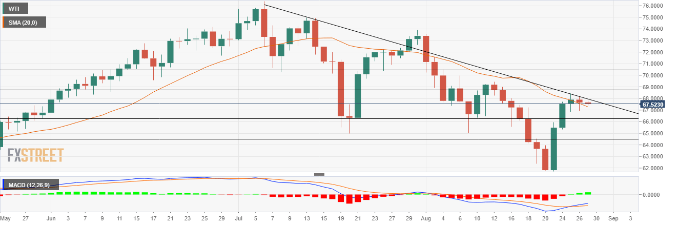 Next, bears would aim toward the low of August 24 at $65.34, followed by the $64.70 horizontal support level.