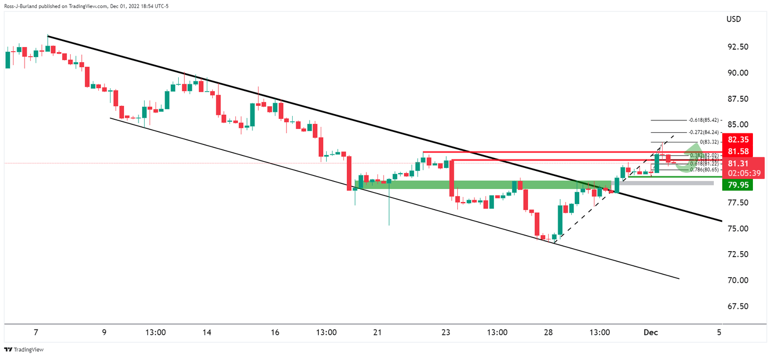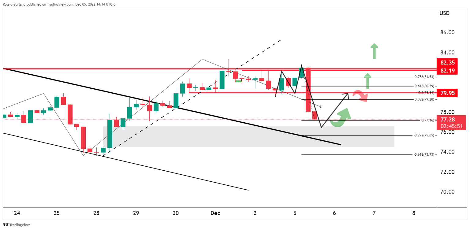 On the 4-hour chart, the M-formation is bullish and a break of the neckline, or a 50% mean reversion, will likely put the bias back in favour of the bull for a continuation higher. After all, the price is on the back side of the channel, so that is longer-term bullish. However, a break below $76.40 will be putting on some serious heat on the committed bulls as per the following daily and 4-hour charts: