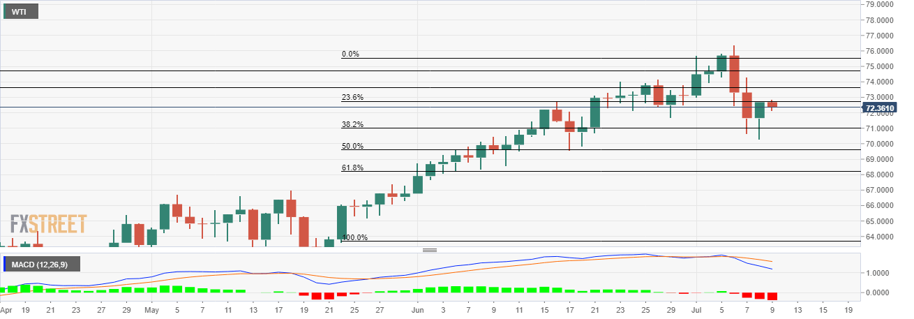 On the daily chart, after testing a fresh YTD high on July 6, crude oil prices fell sharply the same day as bulls were not able to preserve the momentum. WTI seems to be exhaustive after a long upside run from the $61.52 made on May 21.