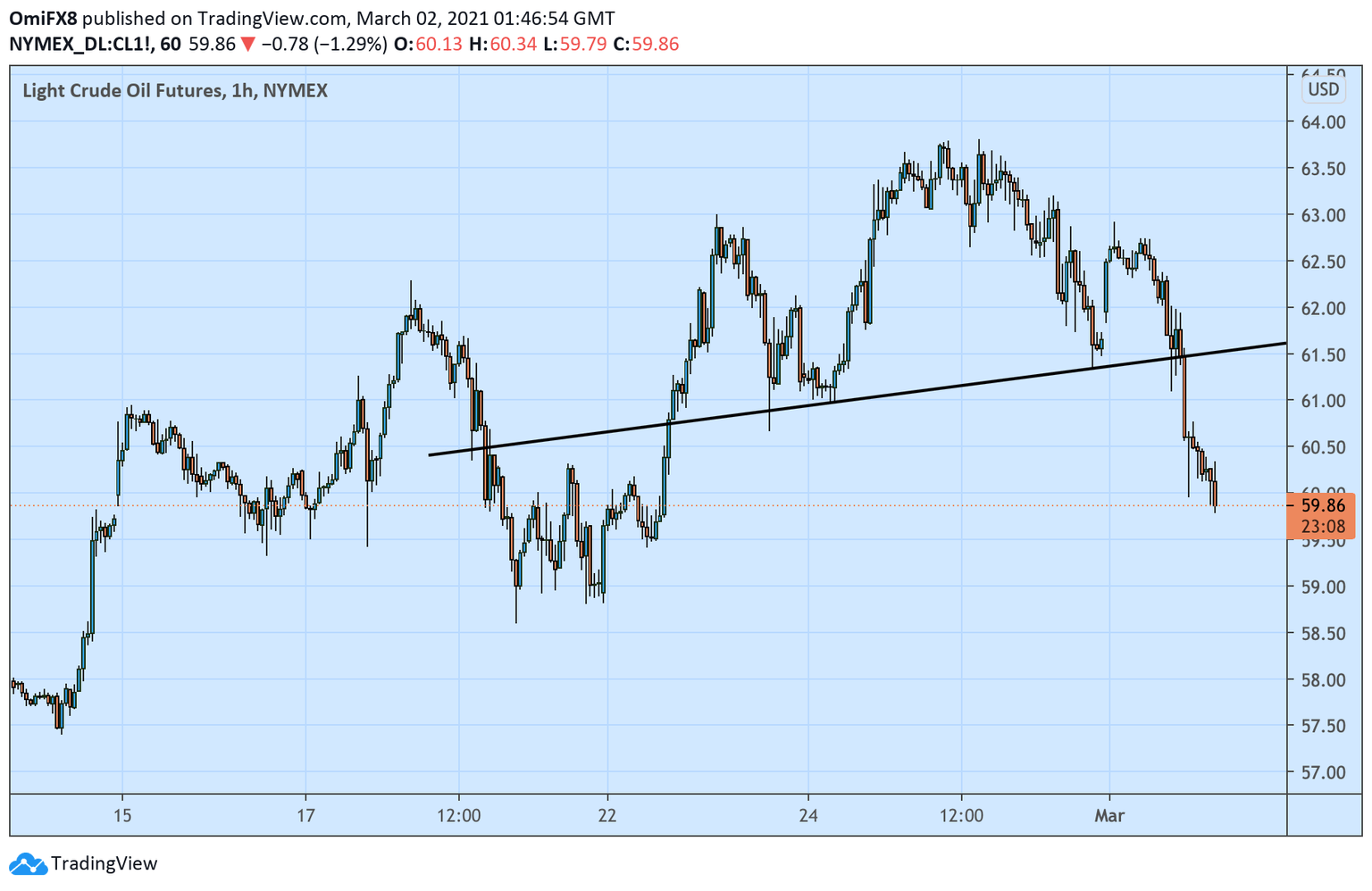 West Texas Intermediate (WTI) crude, a North American oil benchmark, printed a low of $59.86 soon before press time, having confirmed a head-and-shoulders (H&S) breakdown, a bearish reversal pattern, on the hourly chart on Monday.