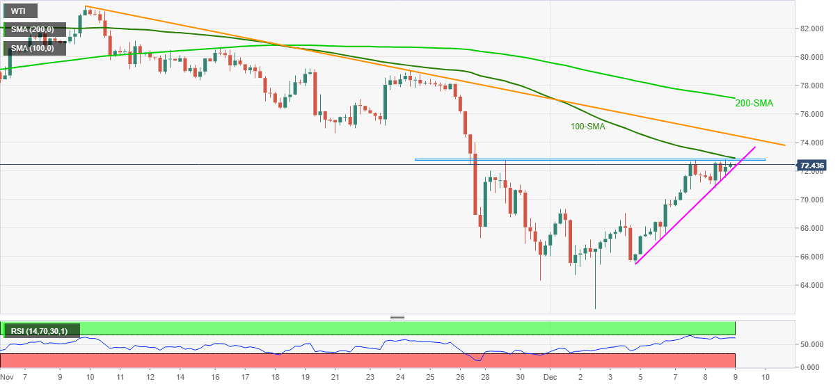 WTI crude oil bulls attack key upside hurdle around $72.50 during Thursday’s Asian session.