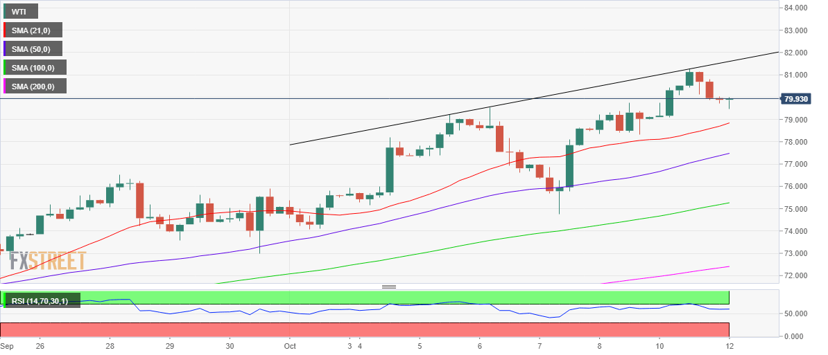 - Rising trendline hurdle at $81.28 on the 4H chart is a tough nut to crack for WTI bulls.