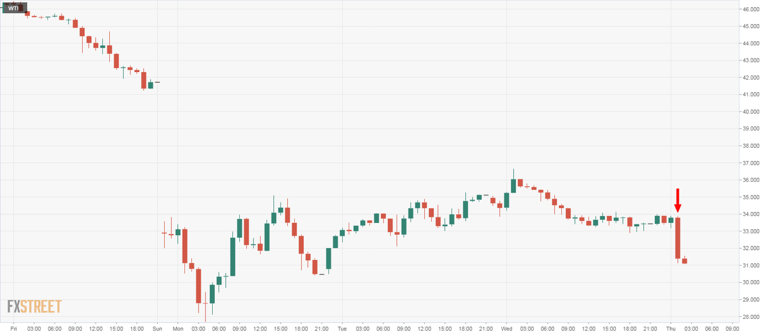West Texas Intermediate oil fell from $33.49 to $30.78 during the 60 minutes to 02:00 GMT as stimulus measures announced by President Trump at 01:00 GMT failed to quell fears of a prolonged coronavirus-led economic slowdown.