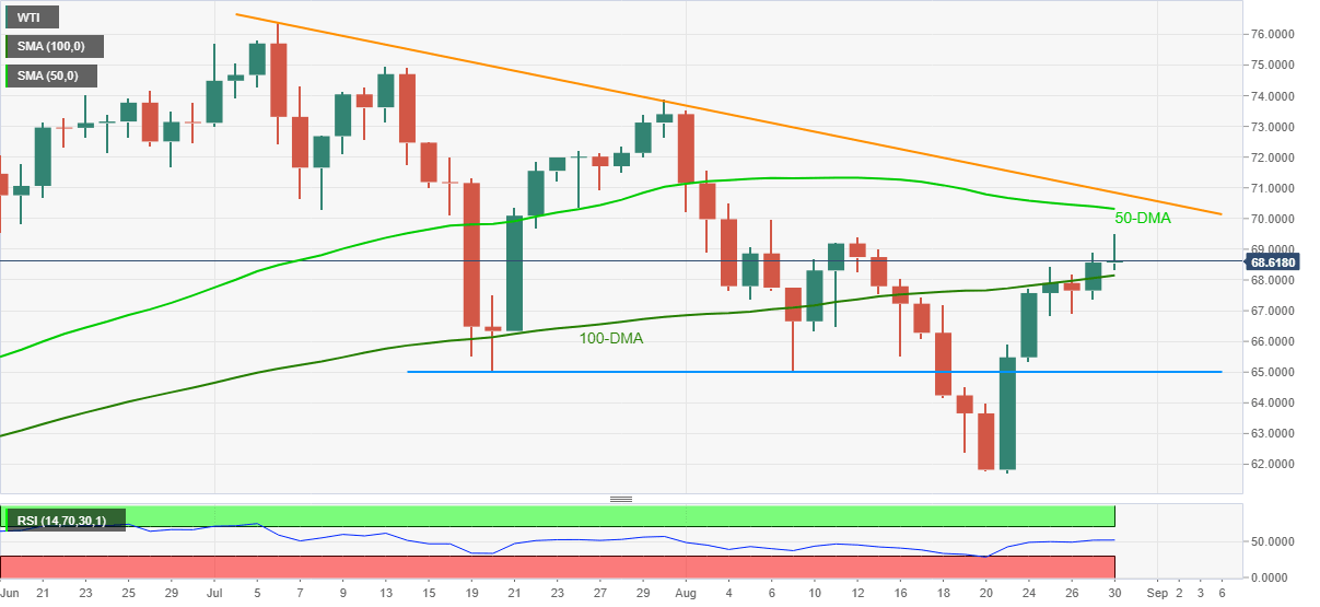 WTI takes offers around an intraday low of $68.35, down 0.08% on a day around $68.50 amid Monday’s Asian session.
