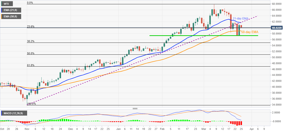 Given the bearish MACD joining the black gold’s sustained trading below the key resistance convergence, WTI sellers eye a 50-day EMA level of $58.93 on the desk as a short-term target.