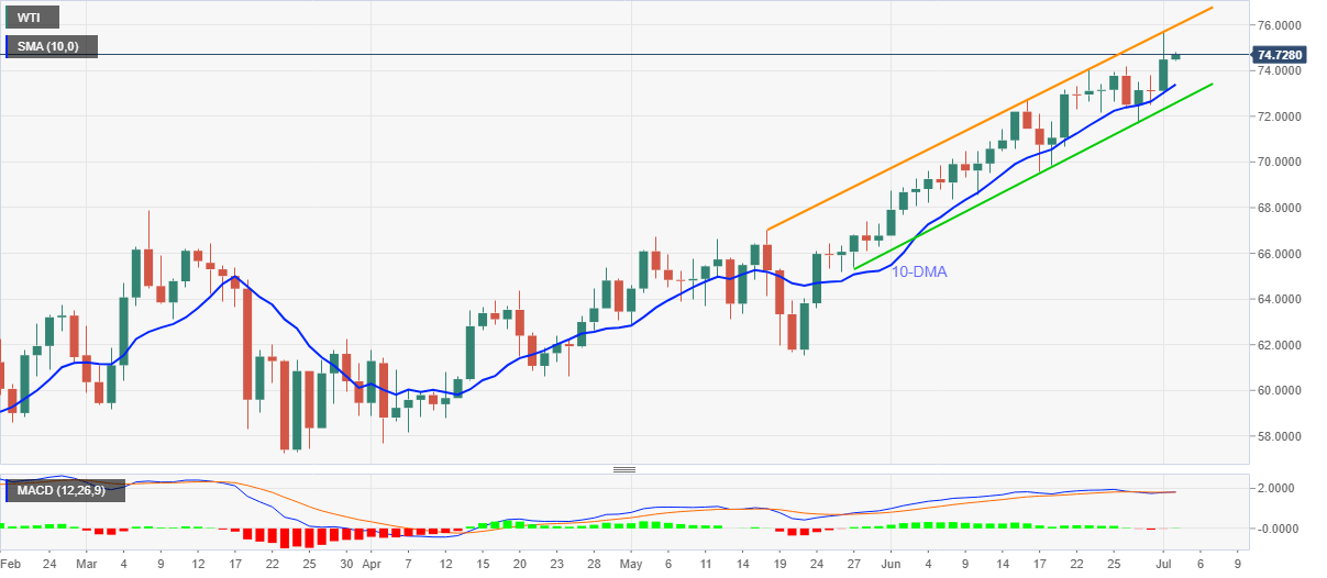 WTI picks up bids near the intraday top of $74.80, up 0.38% on a day, during early Friday. The black gold refreshed the multi-day top the previous day while extending the early week’s U-turn from 10-DMA.