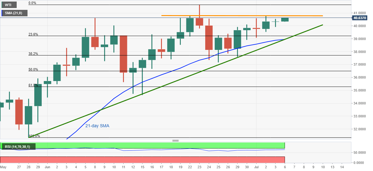 In doing so, a horizontal resistance comprising highs marked on June 22 and July 02, around $40.80, followed by $41.00 round-figures, might offer immediate resistance to the quote.