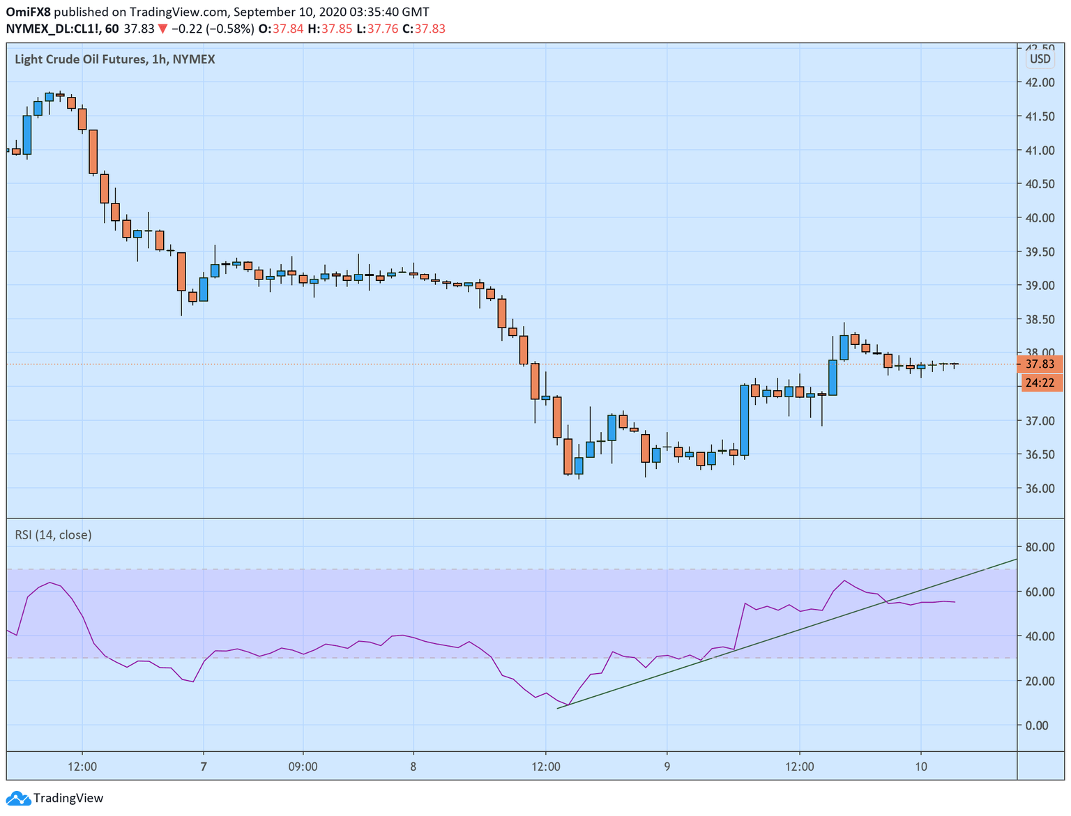 The hourly chart relative strength index has dived out of an ascending trendline, indicating an end of the black gold's bounce from weekly lows near $37.00.