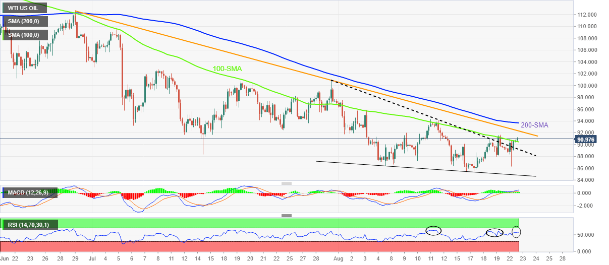 WTI crude oil buyers defend the $91.00 breakout heading into Tuesday’s European session. In doing so, the black gold justifies the previous day’s upside break of the 100-SMA, as well as the bullish MACD signals.
