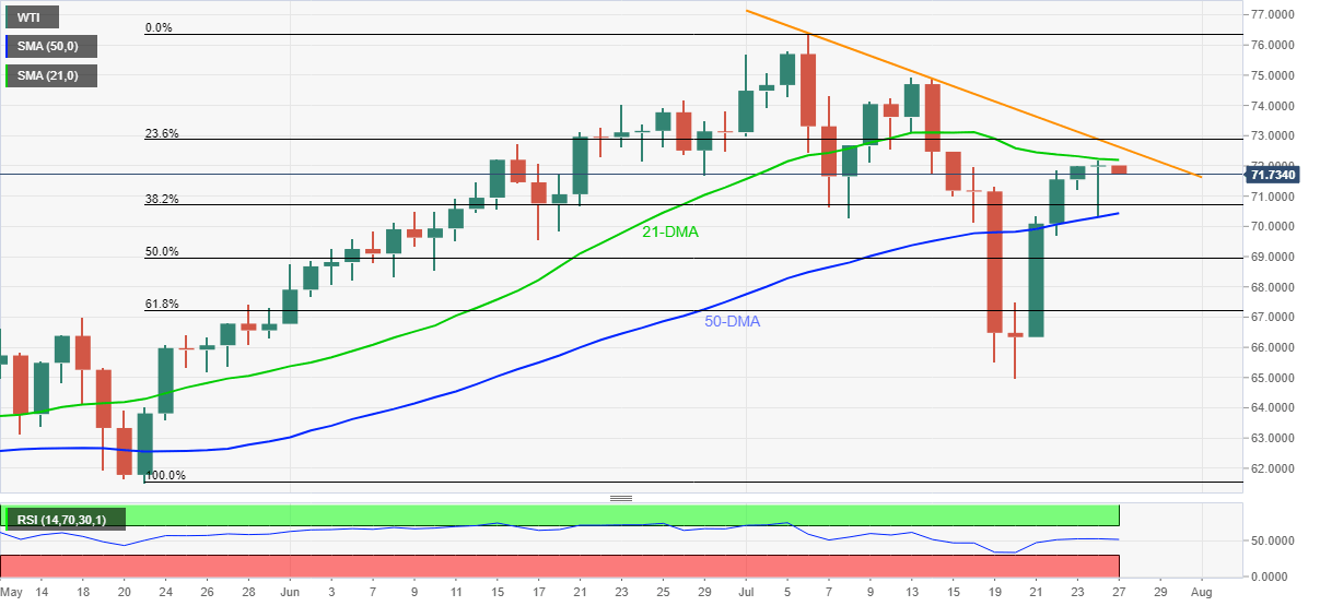 WTI crude oil takes offers around $71.70, down 0.40% intraday, amid Tuesday’s Asian trading. The oil benchmark refreshed one week top the previous day before taking a U-turn from 21-DMA. It should be noted, however, that the quote keeps an upside break of 50-DMA amid a steady RSI line.