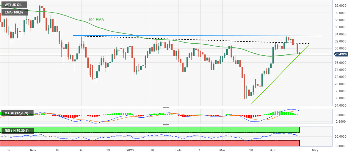 WTI crude oil renews a two-week low to around $78.30 as it drops for the fourth consecutive day heading into Thursday’s European session. In doing so, the energy benchmark prods the 100-day Exponential Moving Average (EMA) while also approaching an upward-sloping support line from March 20.