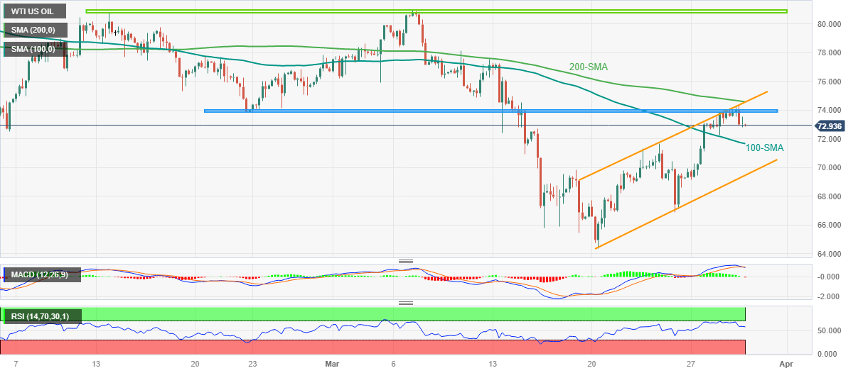 WTI crude oil seesaws around $73.00 during Thursday’s sluggish Asian session, following its pullback from a 12-day high. In doing so, the black gold remains with the fortnight-old ascending trend channel while retreating from the channel’s top line and a five-week-long horizontal hurdle of late.