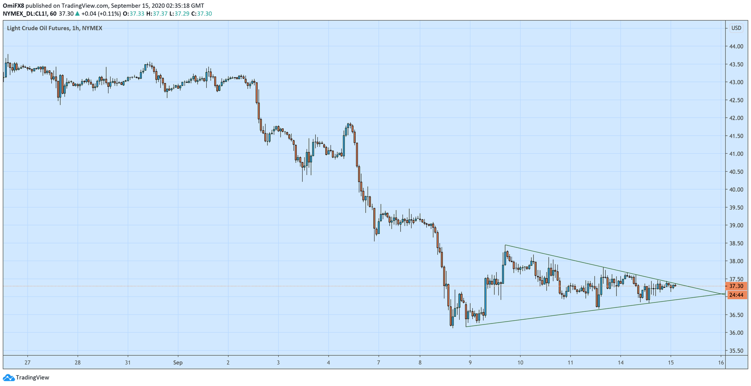 - WTI's hourly chart shows a pennant pattern or contracting triangle.