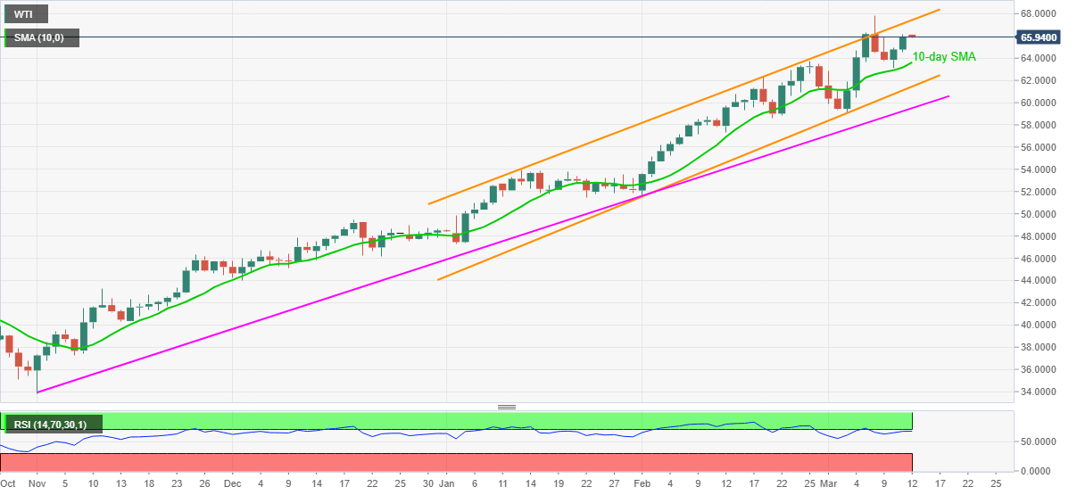 WTI bulls catch a breather around $66.00, currently down 0.22% intraday near $65.90, amid Friday’s Asian session. In doing so, the energy benchmark drops for the first time in three days while teasing the multi-month tops marked earlier in the week.