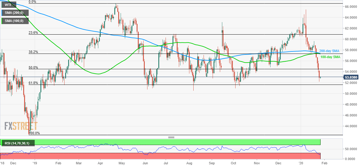WTI bears catch a breath as the quote flashes $53.00 during the initial trading session on Tuesday. The energy benchmark recently dropped to the lowest since October and is declining towards 61.8% Fibonacci retracement of its upside from December 2018 to April 2019.