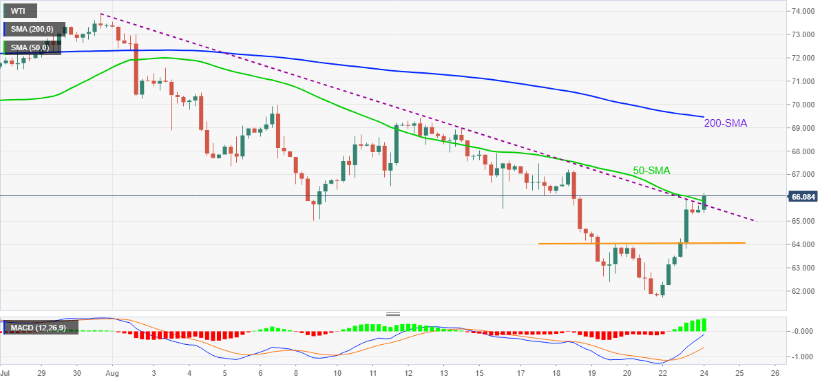 WTI crude oil prices take the bid near $66.08, up 1.0% intraday, during early Tuesday. In doing so, the black gold rises past 50-SMA and a downward sloping trend line from July 30 to refresh the one-week high.