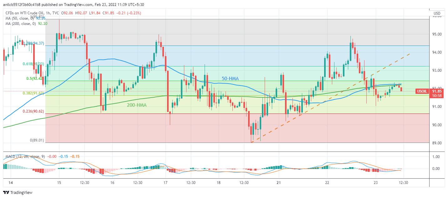 WTI crude oil prices drop back towards $92.00 while consolidating intraday gains ahead of Wednesday’s European session.