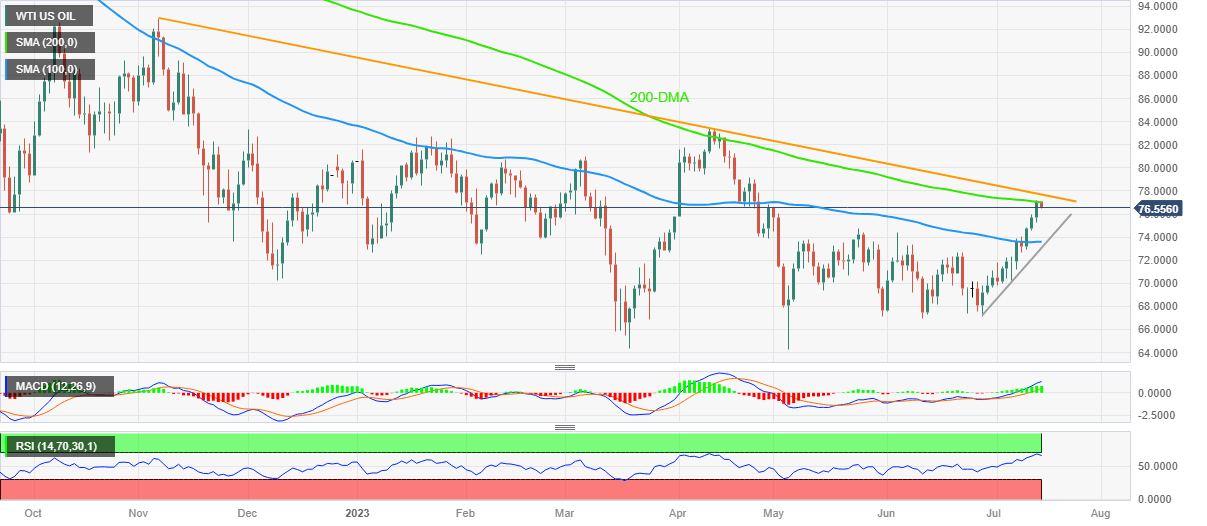 WTI crude oil remains on the back foot at the intraday low surrounding $76.50 as it prints the first daily loss in four, so far, heading into Friday’s European session. In doing so, the black gold reverses from the 200-DMA hurdle while justifying the overbought RSI (14) line.