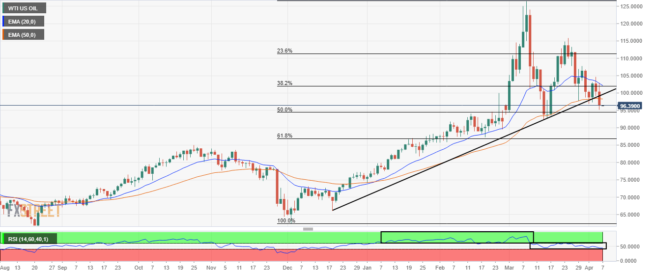 WTI Price Analysis: Skids below 50-EMA first time in 2022, $90.00 eyed