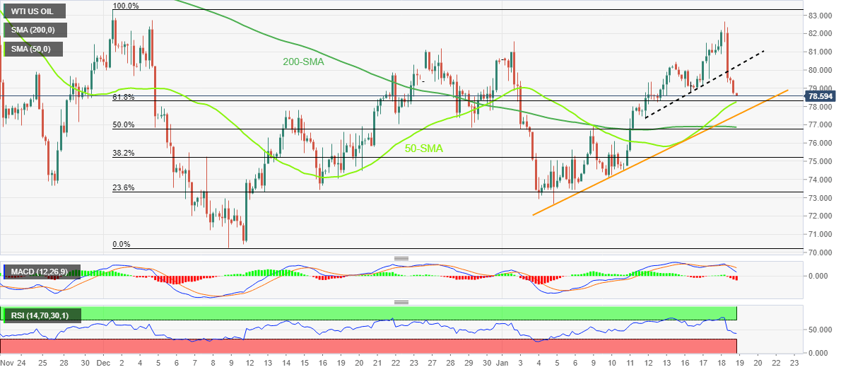 It’s worth noting, however, that a convergence of the 50-SMA and the 61.8% Fibonacci retracement level of the quote’s weakness during early December, near $78.30, appears a tough nut to crack for the short-term WTI bears.