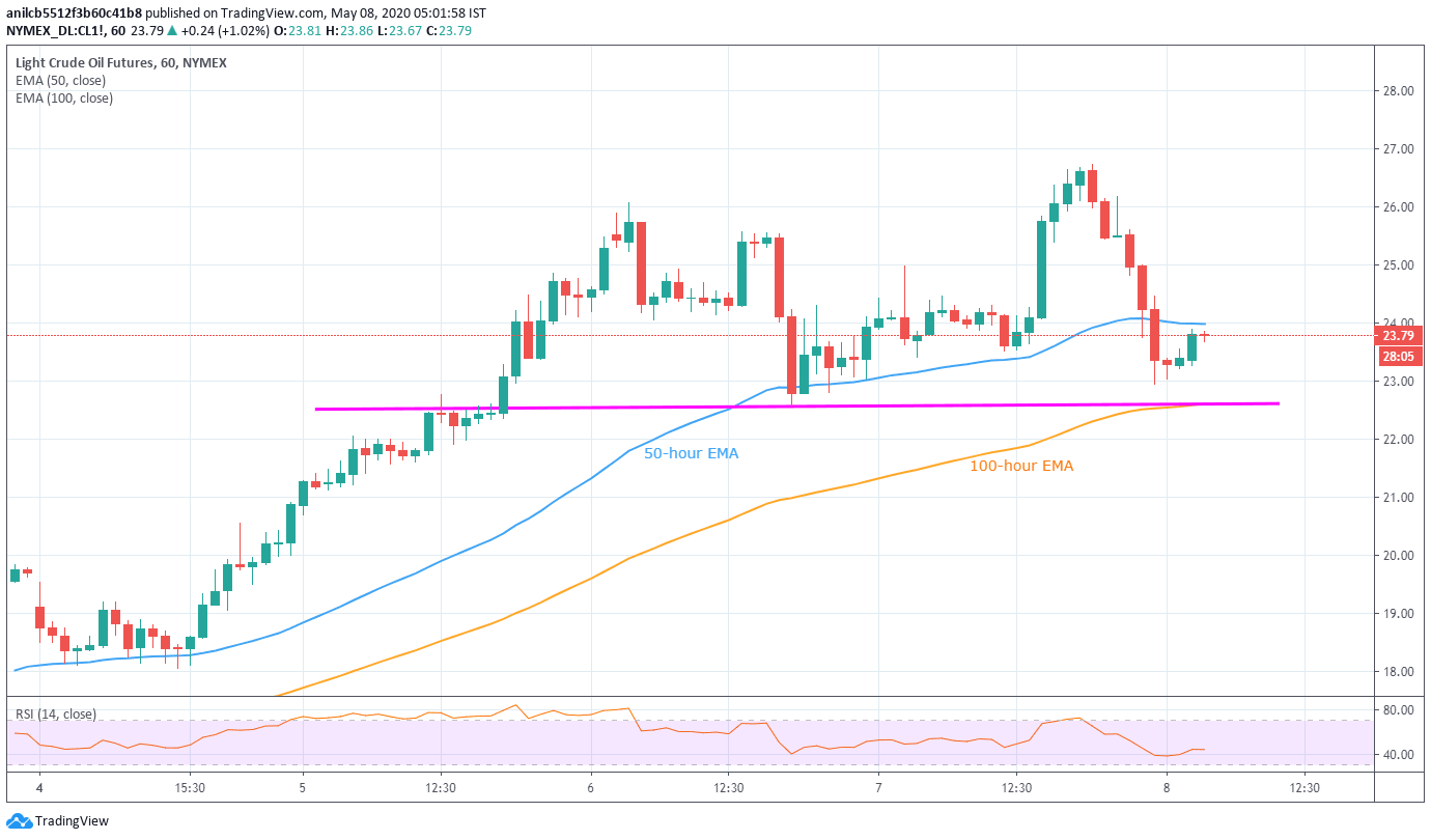 Considering the gradually recovering RSI, the energy benchmark could extend the latest recoveries towards a 50-hour EMA level of $24.00. Though, a break of which will help buyers challenge Wednesday’s top near $26.10.