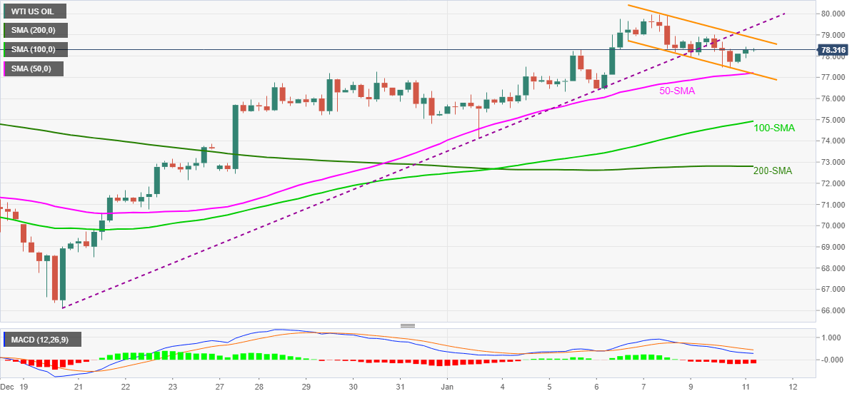 Meanwhile, a convergence of the nearby channel’s support line and 50-SMA limits short-term declines of the WTI near $77.20.