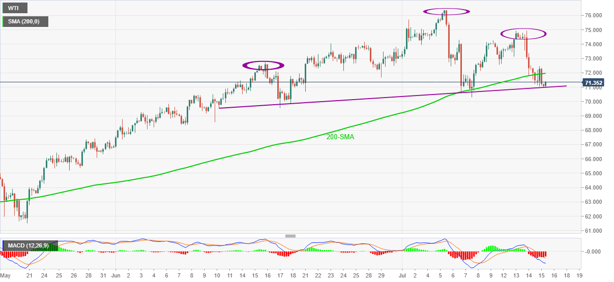 - WTI bounces off intraday low, from the neckline of bearish formation.