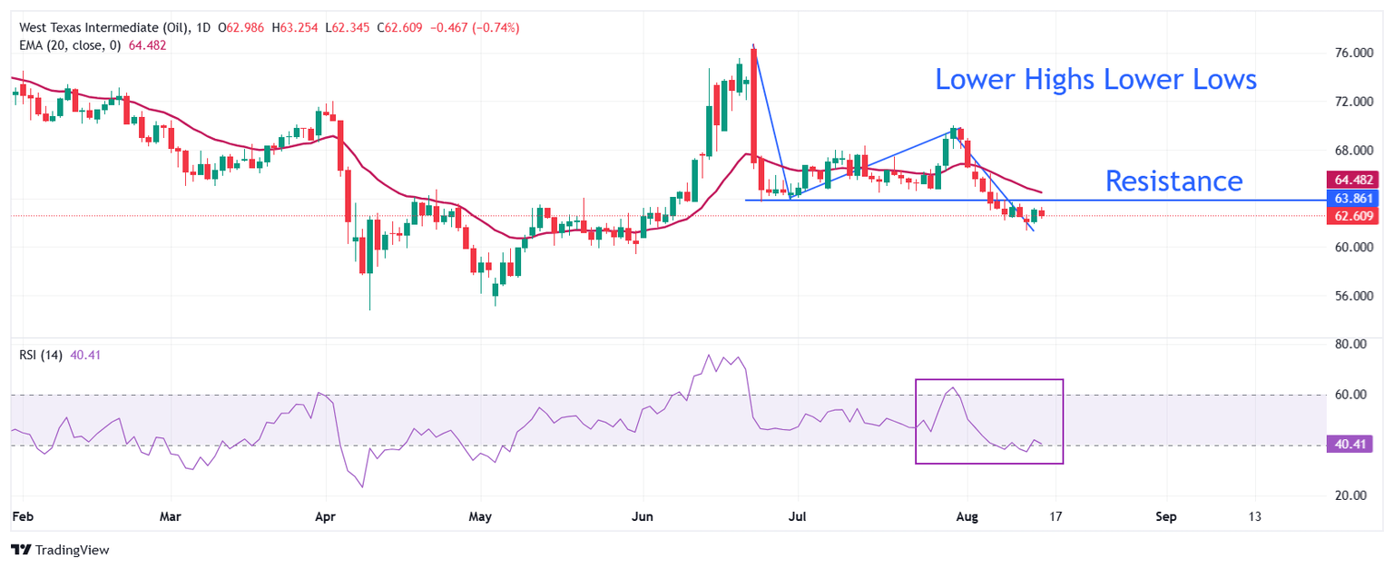 The formation of a fresh swing low by the Oil price near $61.35 on August 13 has confirmed a lower high and lower low structure, which indicates a bearish trend. The downward-sloping 20-day Exponential Moving Average (EMA) near $34.48 also suggests that the near-term trend is bearish.