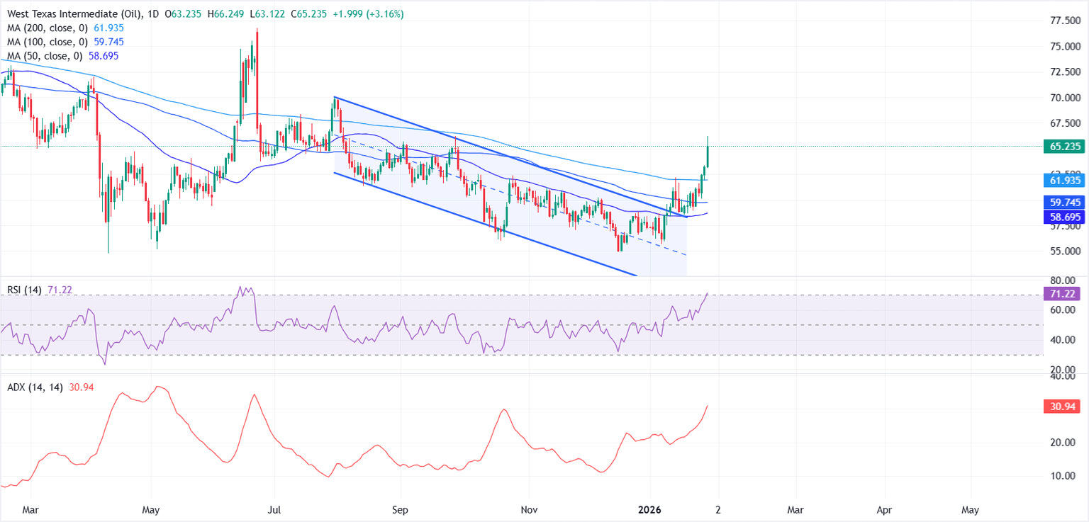 West Texas Intermediate (WTI) Crude Oil extends its advance on Thursday, briefly climbing to its highest level since August 4 as geopolitical risk premiums linked to rising US-Iran tensions underpin prices. At the time of writing, the US benchmark is trading around $65.20 a barrel, consolidating after touching an intraday high near $66.24.