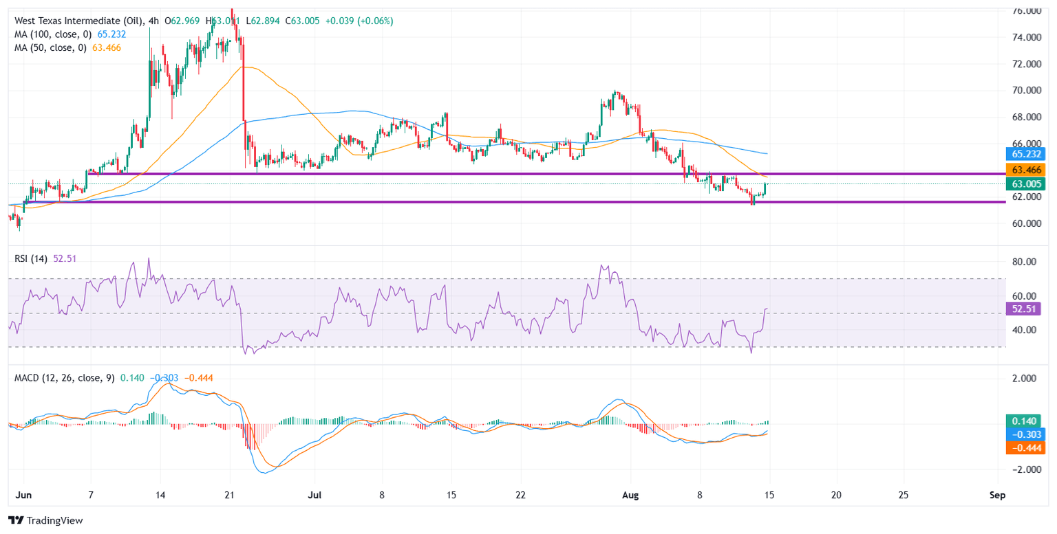 West Texas Intermediate (WTI) Crude Oil edges higher on Thursday, supported by heightened geopolitical tensions ahead of the Friday US-Russia summit in Alaska. At the time of writing, WTI trades near $63.00 per barrel, up around 1.50% on the day, after touching its lowest level in over two months on Wednesday.